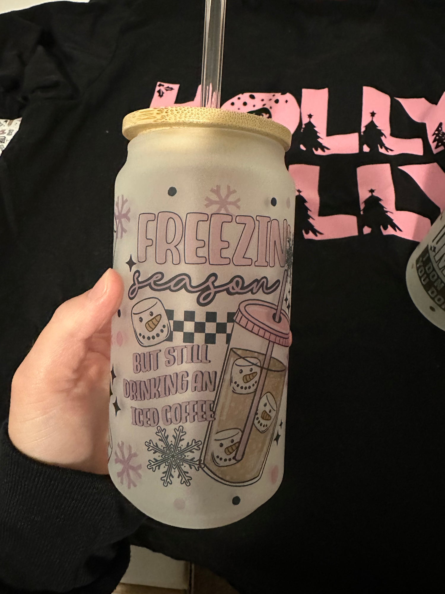 Freezing season but still drinking my ice coffee 18oz glass cup with lid and straw